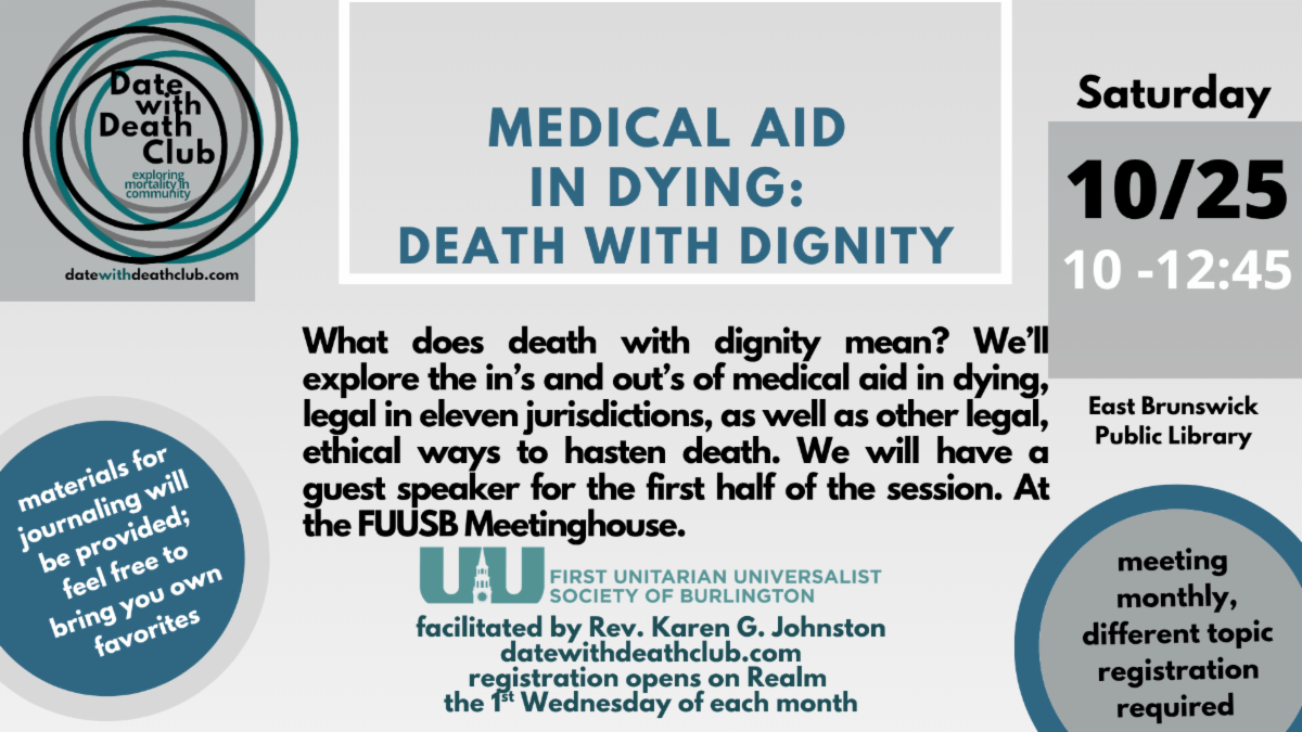 This month's Date with Death Club session is on Saturday, Oct 25 at 10am. The topic is Medical Aid in Dying and we will have a guest speaker. Registration is required - click here to do so.