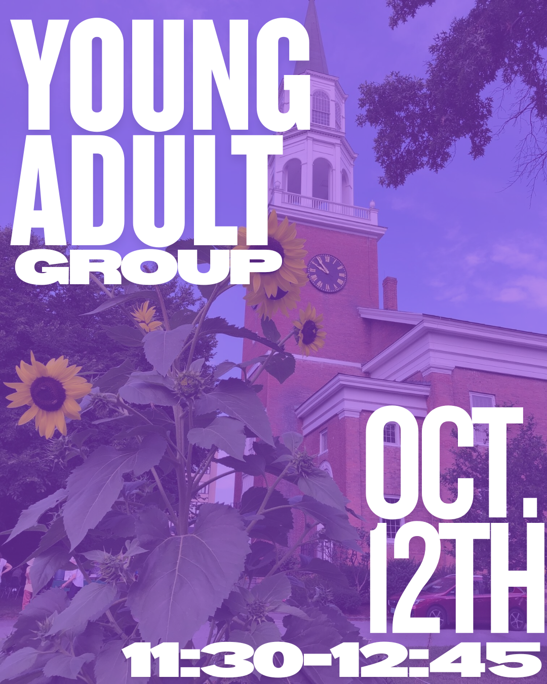 The young adult group is having our next meeting on Oct. 12th from 11:30-12:45, right after the service in the Susan B. Anthony room at FUUSB! Come join to keep building the young adult community.