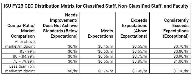 - ISU will continue to ensure that classified staff are paid no less than 73% of policy, (or midpoint), based on the new FY2023 pay structure.