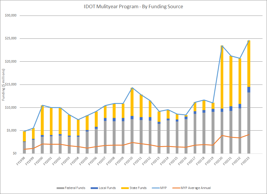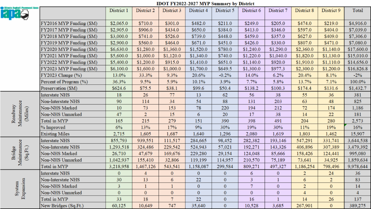 The MYP2023 is about $4 billion more than the MYP2022. The increase in funding levels is a result of the Infrastructure Investment and Jobs Act (IIJA). However, total roadway maintenance miles have decreased to 2,562 miles in the MYP2023 which accounts for 16% of the highway miles under IDOT jurisdiction. District 2 has the largest increase (+59) in miles programmed for roadway maintenance while District 3 has the largest decrease (-92). District 7 has the most miles (491) programmed for roadway maintenance while District 5 has the least (151).