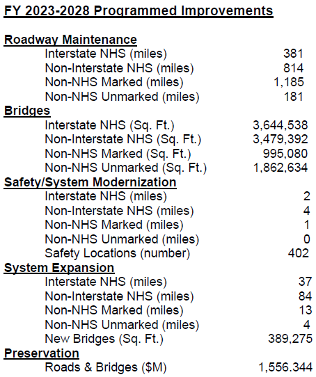 - Roadway Maintenance - $6.36 billion for reconstruction, resurfacing, widening, and preservation, including $1.07 billion for interstate resurfacing projects.