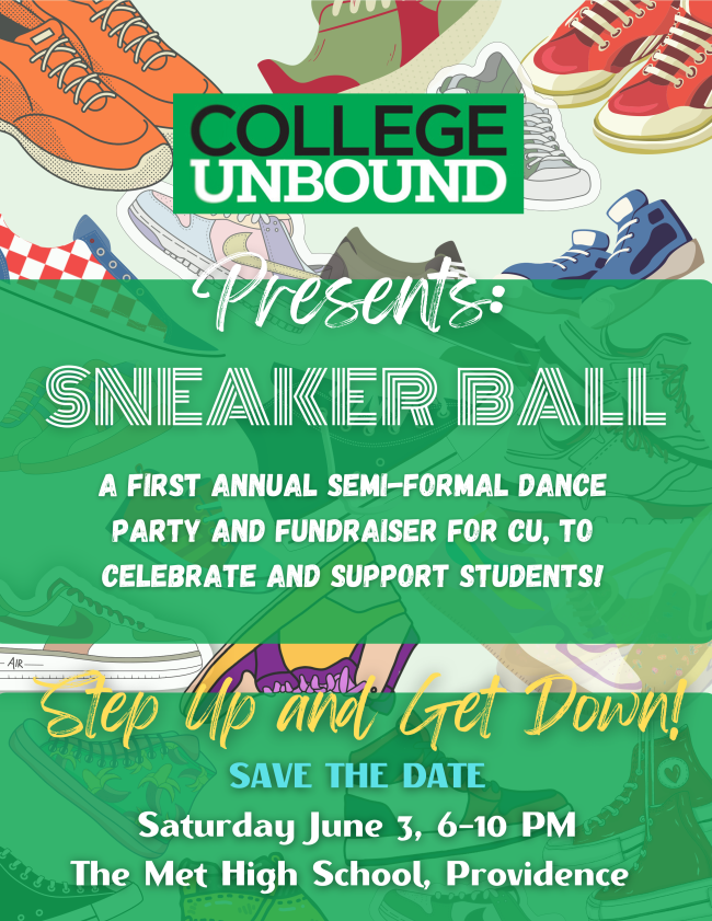 Save the Date! Our inaugural College Unbound Sneaker Ball, a semi-formal dance and fundraiser at the Met High School in Providence to celebrate and support our wonderful students! Stay tuned for more.