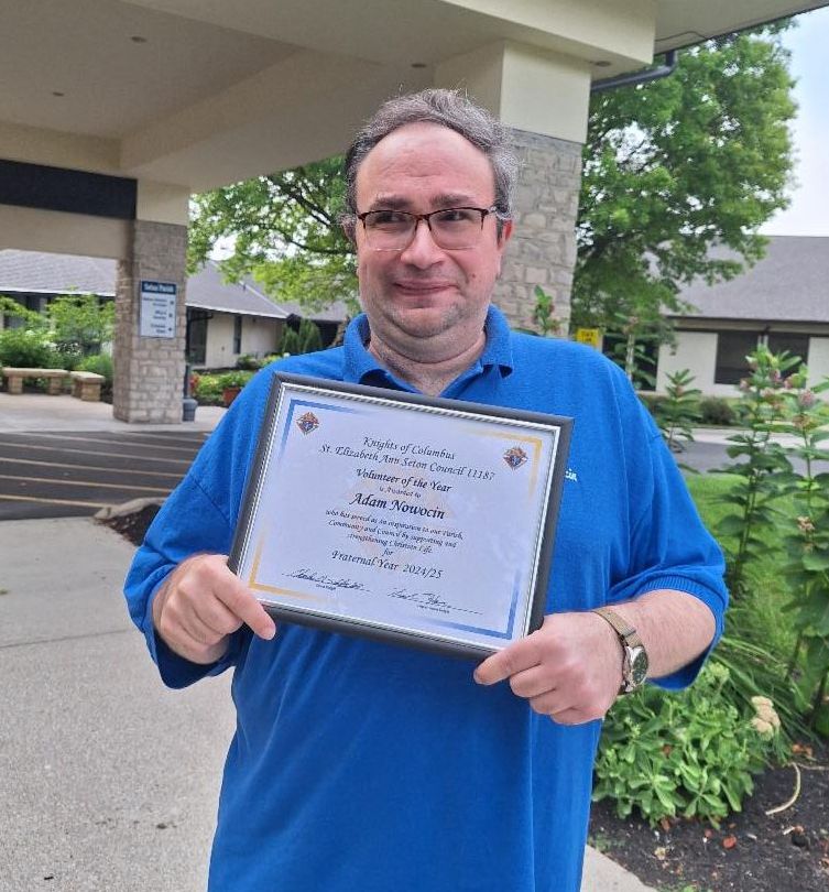 In recognition of his outstanding service, Adam Nowocin has been named Volunteer of the Year by the Knights of Columbus St. Elizabeth Ann Seton Council 11187 for the 2024–2025 Fraternal Year. The award’s inscription reads: