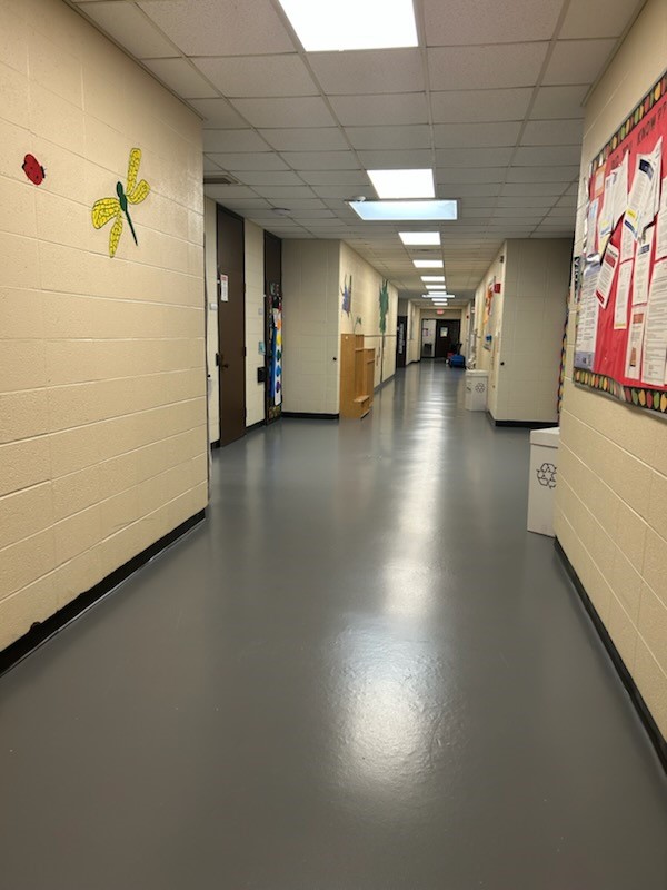 Hallway floors were repaired and refinished, with experts weighing in on texture, color, accessibility guidelines, and best practices to ensure the best materials were selected. The library now shines with a fresh coat of paint and brighter lighting, and classrooms feature new U-bolt security latches for added safety. Outside, the merry-go-round and other playground features were refinished and power washed, along with the school entrance and concrete walkways. Even the parking lot got a facelift, though after the recent flooding, it already looks a little “well-loved.”