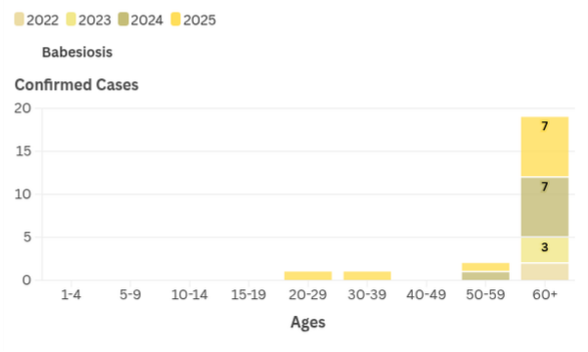 | | Who's most at risk for Babesiosis in Essex County? | | Many older adults engage in outdoor activities, increasing their exposure to tick habitats. Additionally, age-related factors like reduced flexibility and impaired sight can make it harder to find and remove ticks, leading to a higher risk of bites. Finally, older adults naturally experience some weakening of their immune systems, and chronic conditions may further compromise the immune response, making older adults more susceptible to illness. | | |