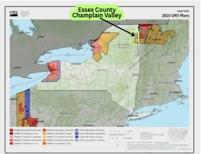 From approximately August 6-12, 867,600 ONRAB baits will be distributed across the Champlain Valley in northeastern New York, northern Vermont and northern New Hampshire by fixed wing aircraft, including