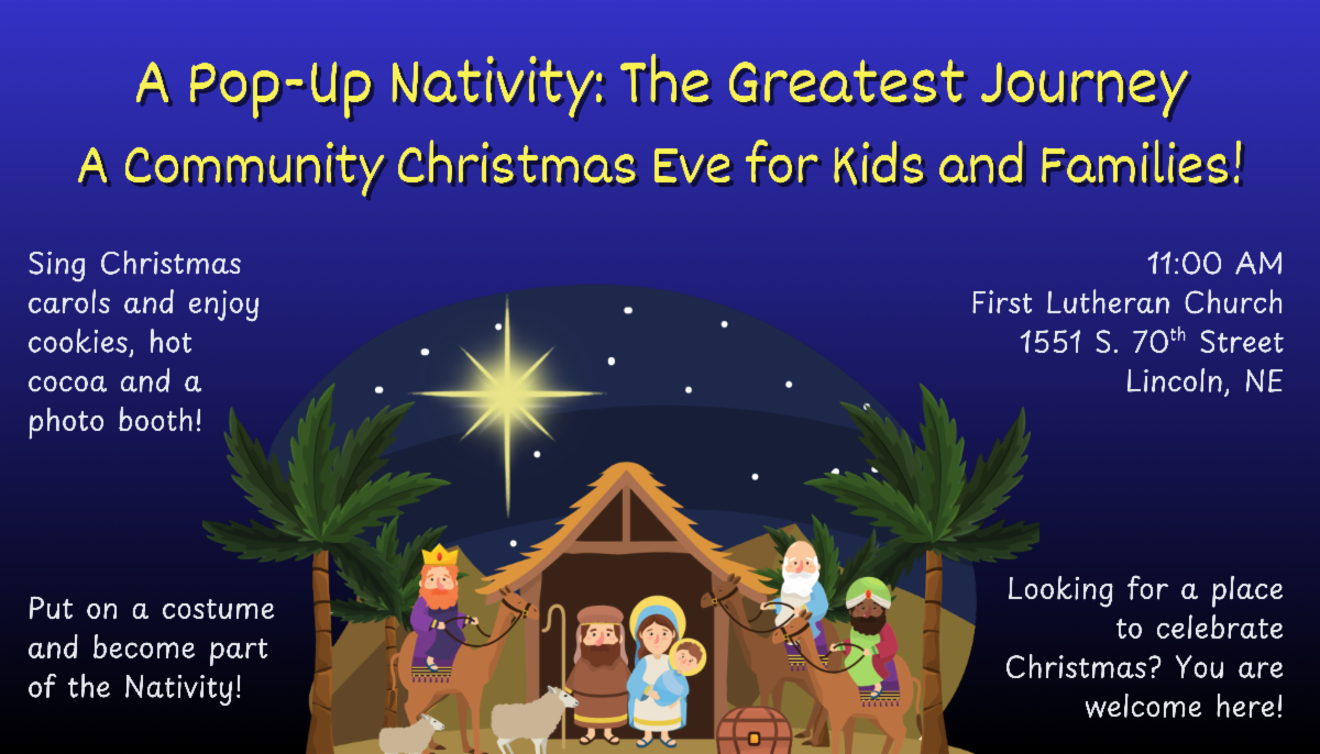 Speaking of Christmas Eve, the 11:00 AM service will be a short, fun interactive play for kids and families! It will be a “pop up” nativity play engaging those who attend, just 30 minutes long and includes carols, a photobooth and cookies and hot cocoa! When families arrive, they will be asked if they want to wear a costume. To make the experience welcoming and inviting for our new visitors and families, I’m asking if any of y’all want to bring your families to the 11:00 AM service. I will need you to come back to the 3:30 PM worship service when your kiddos will be sharing music!