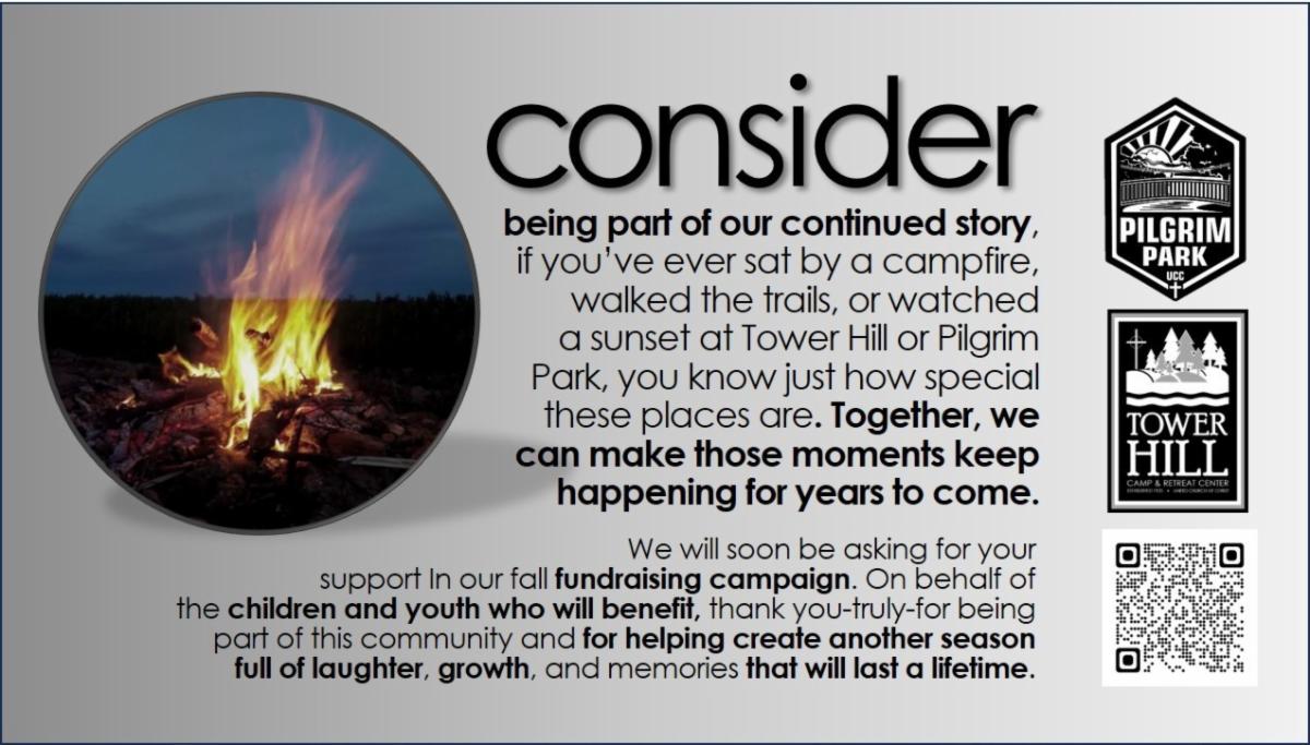 We provide a diverse range of camping experiences, retreats, and special events suitable for individuals of all ages. For further details, please contact Tower Hill at 269-426-3881 or Pilgrim Park at 815-447-2390.