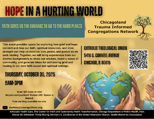 Come together with friends and colleagues from the Chicagoland Trauma Informed Congregations Network to explore how grief and hope connect and how our faith, spiritual resources and inner strength can help us mobilize love, peace, and justice. Download the program here