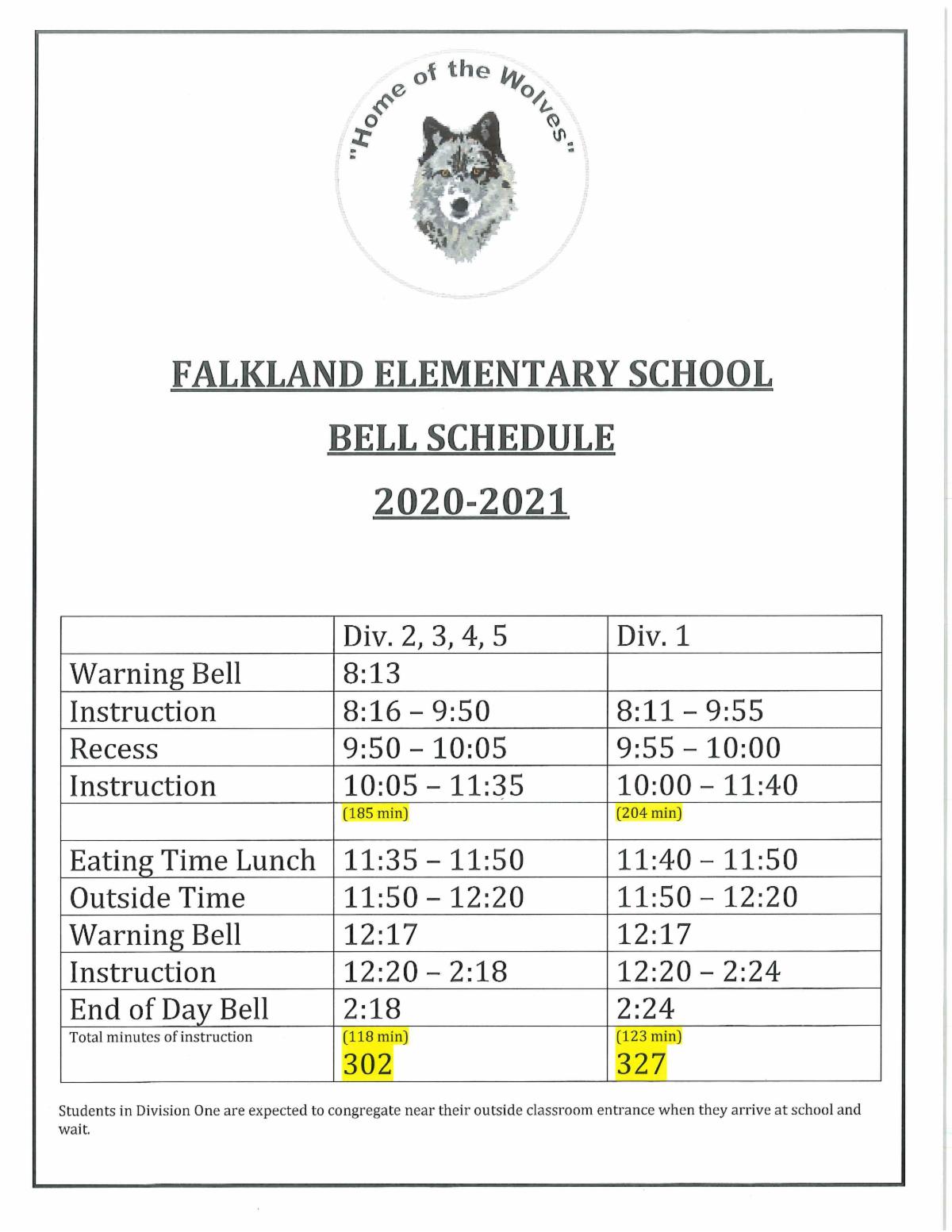 Grade 8 students have more instructional time required than students in grade k-7, therefore their bell schedule looks different. Next year, in order to better reflect a 60/40 split (consistent in the district) with mornings and afternoons, students in Division 1 at Falkland School will have a later dismissal time. While the 327 minutes of instructional time is for grade 8s, all students in Division 1 will follow the schedule in order to promote greater classroom community. The end of day bus schedule will accommodate this change.