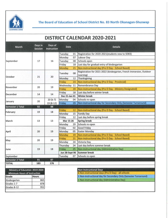 Due to the late start up in September (Tuesday, September 8) and early end in June (Thursday, June 24) we will not be able to meet the required amount of instructional time with the existing bell schedule. Next school year, all schools in SD83 need to add minutes in order to meet these requirements outlined in the School Act.