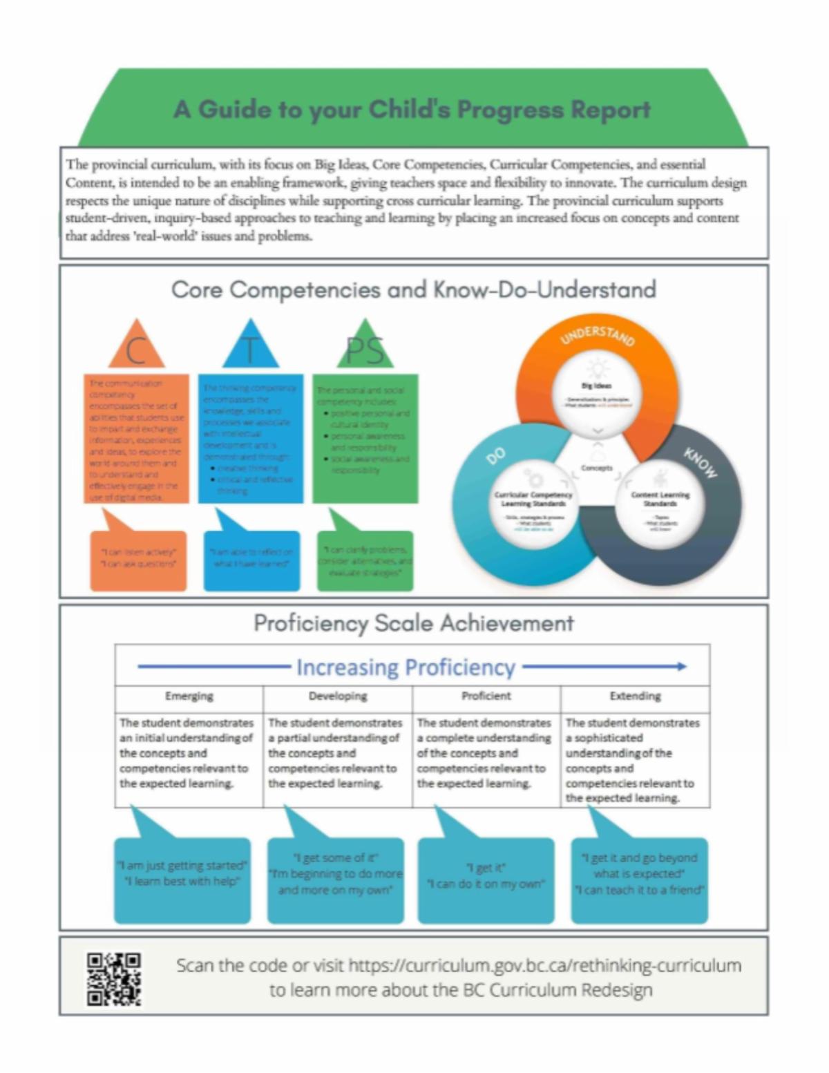 Please celebrate your children's learning and accomplishments with them. If you have questions about your child's progress or educational program, please contact your child's teacher. Teachers will be available on Friday, June 25th. Mrs. Cull can be reached over the summer through email scull@sd83.bc.ca. Keeping you informed is important. Here is the summary page that can be found at the end of the report card. Please reference it for a description of the proficiency levels that are now used throughout the province and information on the Core Competencies.