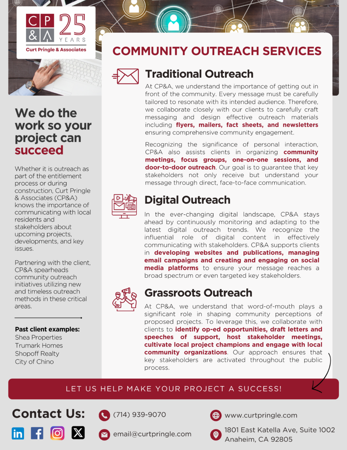 A key service we offer to many of our clients is comprehensive community outreach support. Whether it is during the entitlement process or construction, we know how critical it is to keep local residents informed and engaged in the development process. From traditional engagement to cutting-edge digital campaigns and grassroots efforts, our multifaceted approach ensures that your project’s key messages are delivered with clarity and precision; in a way that builds trust and support.