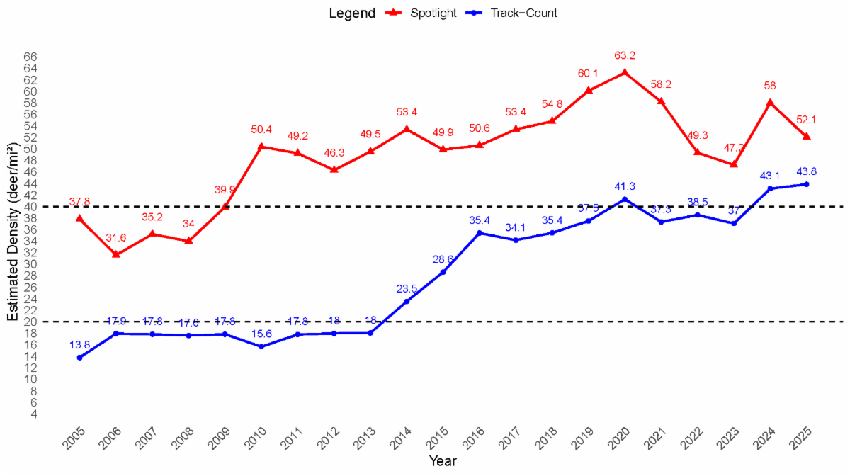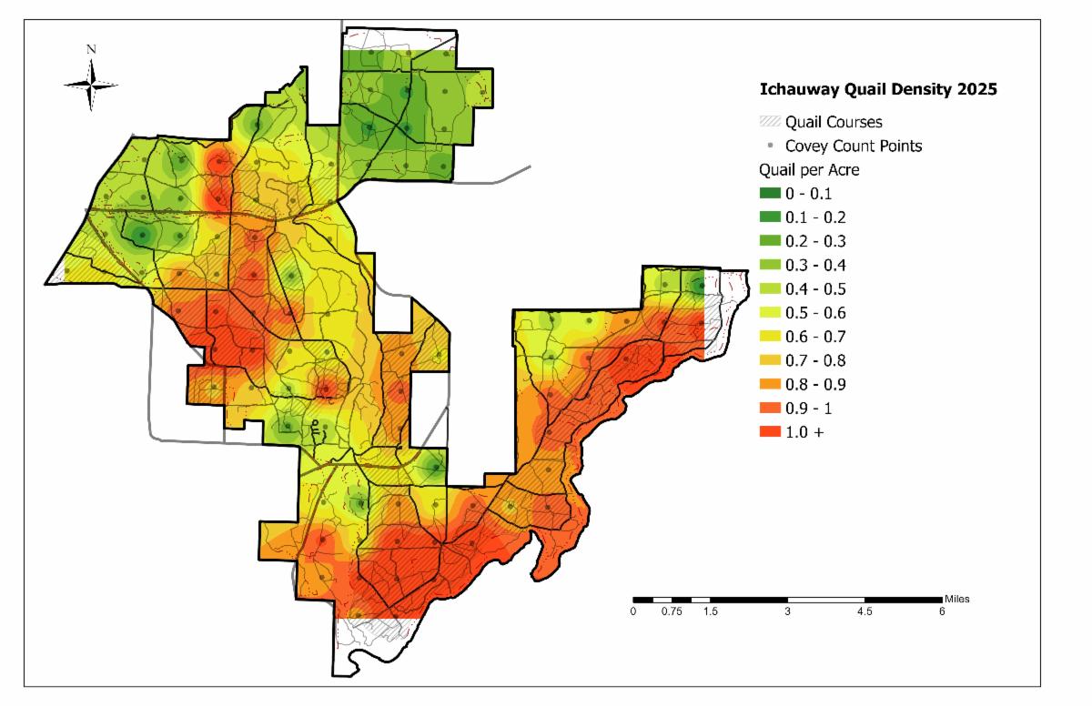 | Conservation Fellowship Program Expands | | In August, the Center added Dalton Ferguson as the newest member of our Conservation Fellowship Program. Advised by Dr. Adam Polinko of Mississippi State University, Ferguson joins Bradley Pruitt and Allie Mitchell, both of whom are well into their fellowships. Pruitt is nearing the end of his second year and has been instrumental in the integration of the new Fellows into the program. He recently completed his Master of Forest Resources and Conservation degree through the University of Florida in August, and Mitchell, nearing the end of her first year, is on track for the same degree. Read more about the Ichauway Conservation Fellowship Program and some perspectives from our three fellows here. | | Wildlife Management Updates | | Ichauway's White-Tailed Deer Population | | Ichauway’s white-tailed deer population remains high at an average of nearly 48 deer per square mile, above our target herd density of 20-40 deer per square mile. The current population estimate is an average of annual spotlight survey and track-count survey data. Our primary objective for our white-tailed deer herd is to regulate population density to limit potential damage to sensitive ecological communities. | | Ichauway's 2025 Quail Density | | Conservation staff conduct Fall Quail Covey Call Counts annually on Ichauway. These counts are used to estimate our quail population density and to provide information for the land manager before quail season. A covey count consists of an observer monitoring and recording the number of quail coveys heard from an established location (point). The location of each covey is recorded on a map, and this information is then analyzed and used to estimate quail density (quail per acre) for the property. Covey call counts are conducted in various habitat types, both within and outside of areas that are more intensively managed for quail (quail courses). Counts are conducted at sunrise from mid-October to early November, during the peak of calling. Fall covey counts have been conducted on Ichauway since 2007. | | Postbaccalaureate Fellow Program Starts New Cohort | | Year 2 of the National Science Foundation-funded Woods to Water Research and Mentorship for Postbaccalaureates kicked off in August with a cohort of 10 fellows selected from nearly 100 applicants. After a successful orientation week in Tuscaloosa, the first five fellows moved down to The Jones Center, where they began lab rotations before ultimately being placed with a home lab. Education staff continued project coordination, while five research labs (Aquatic Sciences, Ecohydrology, Ecological Silviculture, Landscape Ecology, and Plant Ecology) will host the current five fellows until mid-February 2025 and provide support for each fellow’s capstone research project until Year 2 concludes in July 2027. Read more about our current five fellows. | | Ichauway CORE Field Courses: Rounding Out an "Ichauway Education" for Our Own | | | | The Center’s Education team facilitated the launch of an internal professional development program called the Ichauway CORE (Conservation, Outreach & Research Experiences) Curriculum in 2024 for graduate students, seasonal and long-term research and conservation technicians, postbaccaulareate fellows, and, in some cases, research associates and Education staff. In 2025, we offered 8 field courses for 46 unique individuals. Perhaps an even more encouraging sign of this multi-disciplinary program’s growth is that 26 unique staff/students, 7 research labs, Conservation leadership, and the Education coordinator have contributed to or led course content. | | |