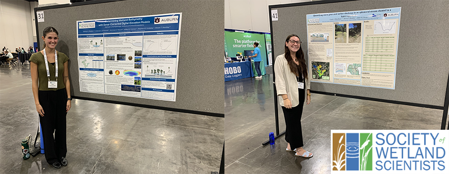 | In late July, members of the Ecohydrology Lab attended the Society of Wetland Scientists meeting in Providence, Rhode Island. Dr. Steven Brantley delivered an oral presentation on wetland ecosystem services, while graduate students Carlie Blackburn and Katy Perkins gave poster presentations on wetland connectivity and wetland bathymetry, respectively. | |