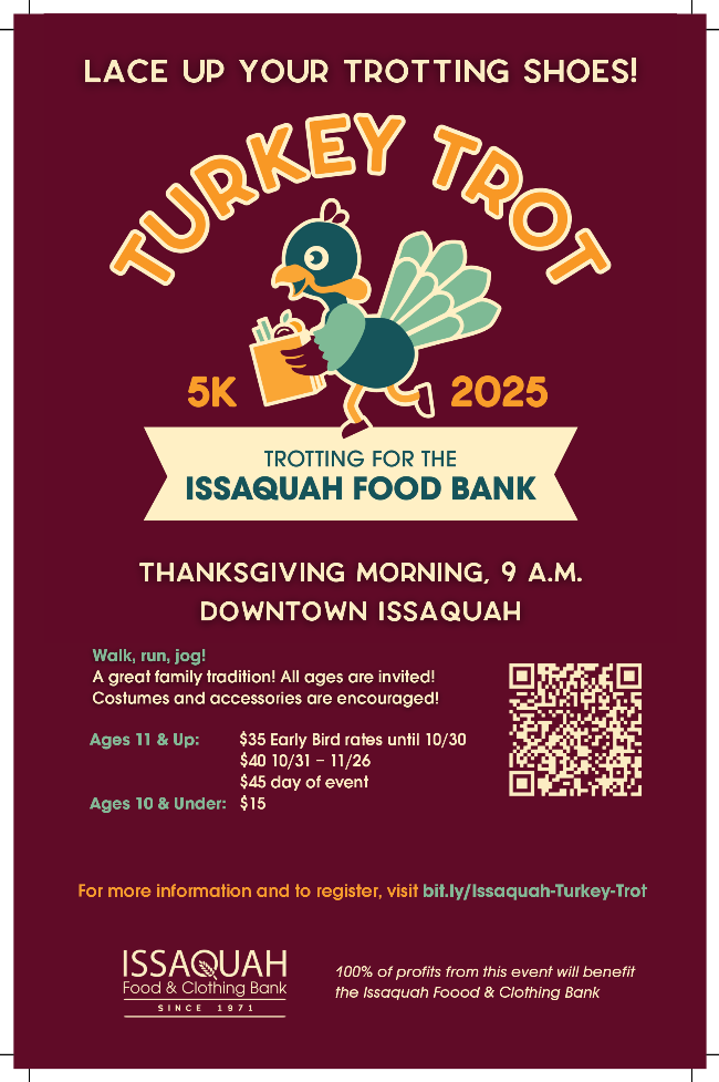 - We ask that you go door-to-door to the businesses and establishments in your assigned area and ask if you can put up a poster or leave a stack of flyers promoting the Issaquah Turkey Trot event, in support of the food bank.