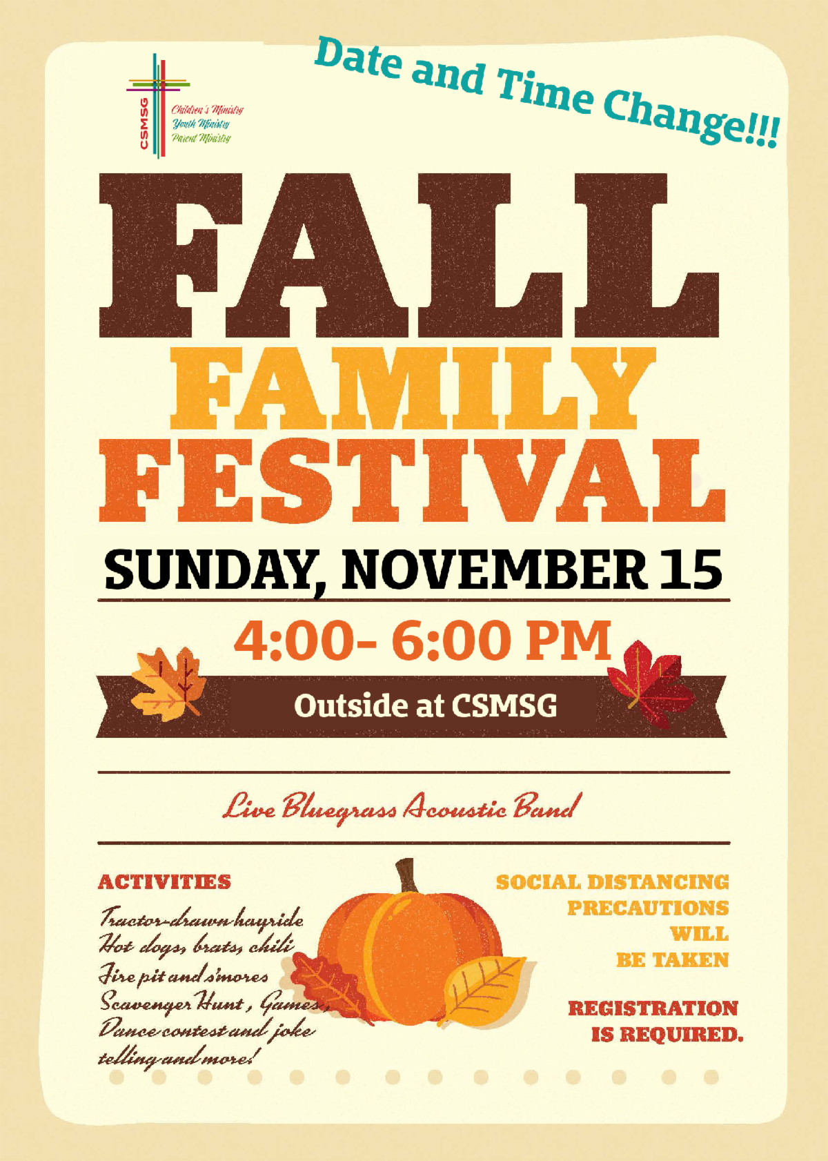 Due to inclement weather in the forecast for Saturday, the Fall Family Festival will be held: