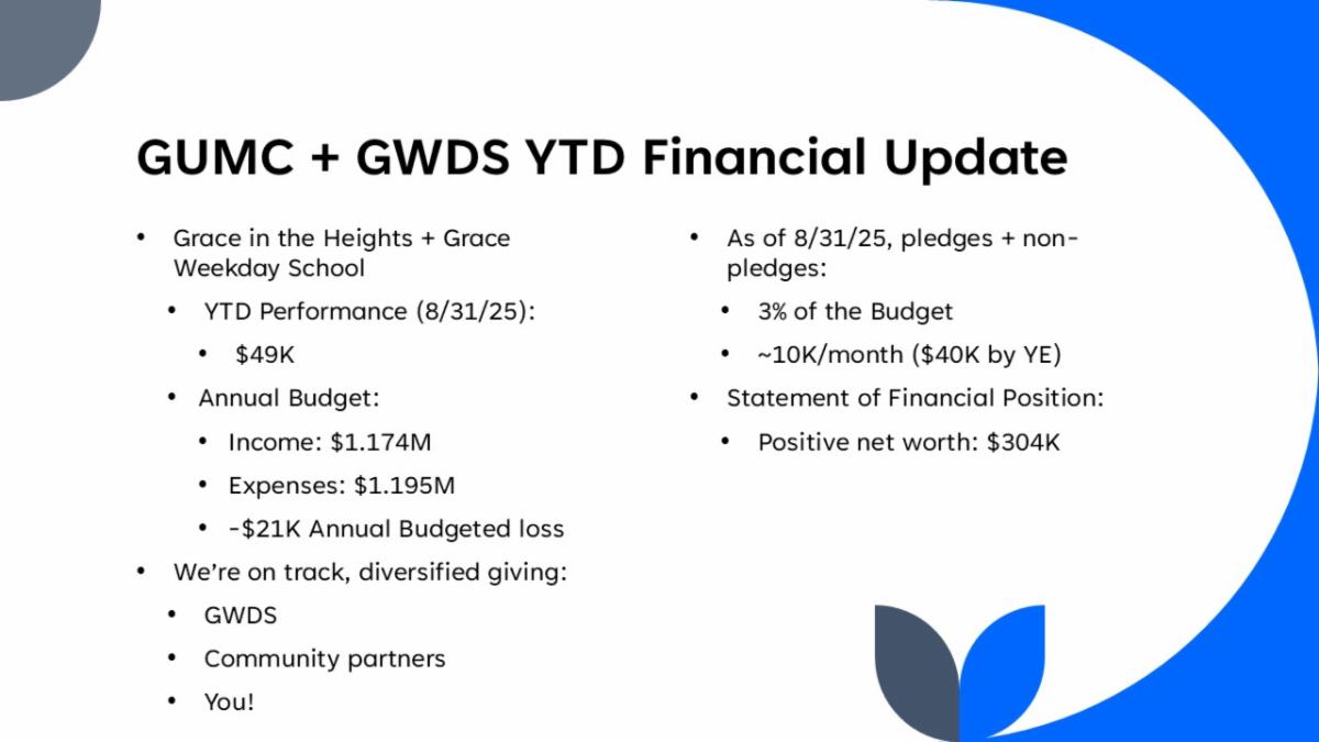- As of 8/31/25, we need $40K to close the gap by year end—please pray about how you will stretch to give in supporting God’s ministry through Grace.