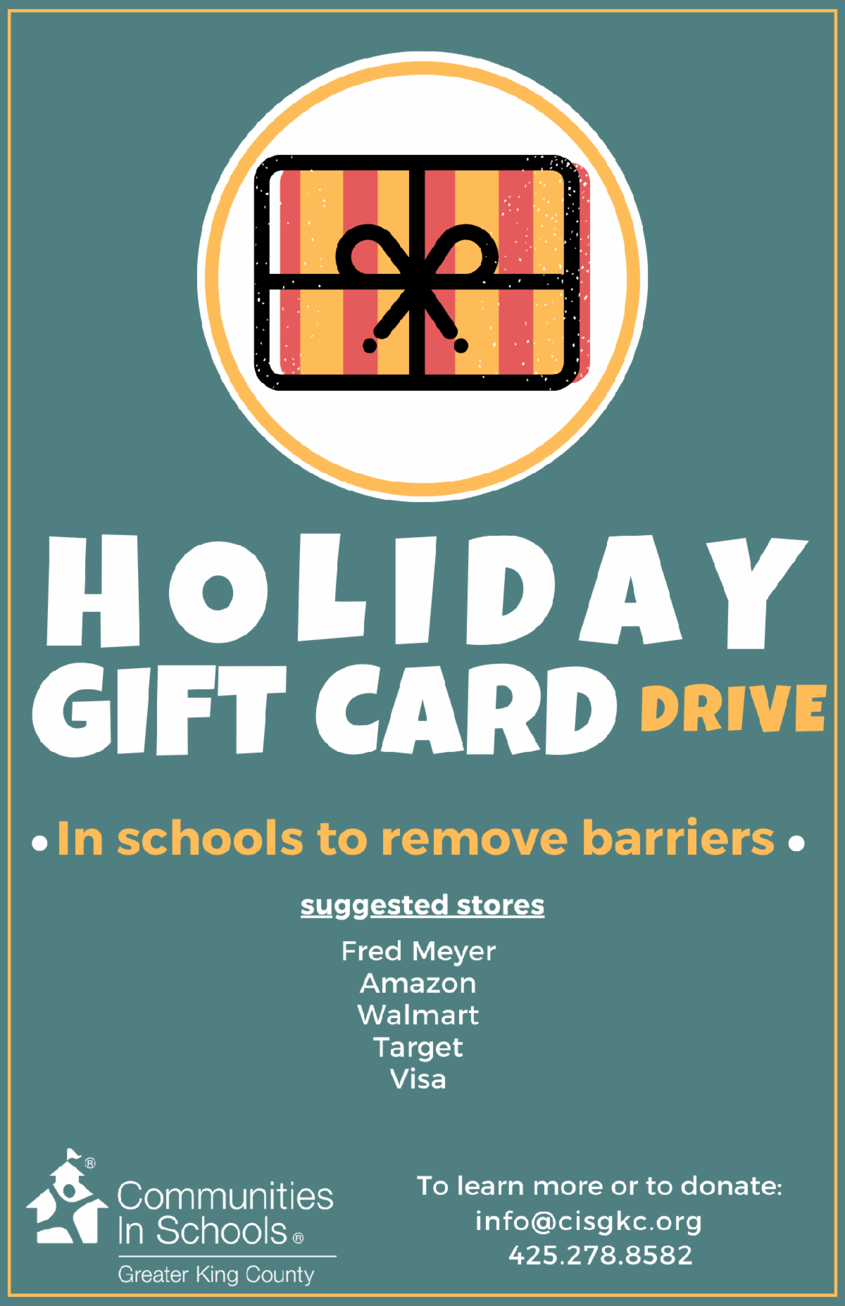 | Annual Gift Card Drive is coming soon: Nov. 15-Dec. 15.