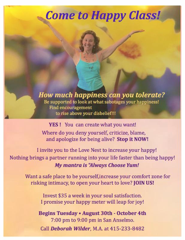 Deborah's "Happy Class" is already finding great response. Her simple and easy steps, taken in a circle of sharing, support you to find the "happiness is real" home in yourself. Come into the comfortable living room of your "genius" as you hold the hand of your disbelief until she is strong enough to live in the truth of who you are! This class has yielded joyful women unleashed to truly enjoy their power! Be in touch - the class starts Tuesday, August 30, for six weeks of re-calibrating your "Happy Meter"! Call 415.233.8482 to sign up or for questions. Deborah & I have been leading
