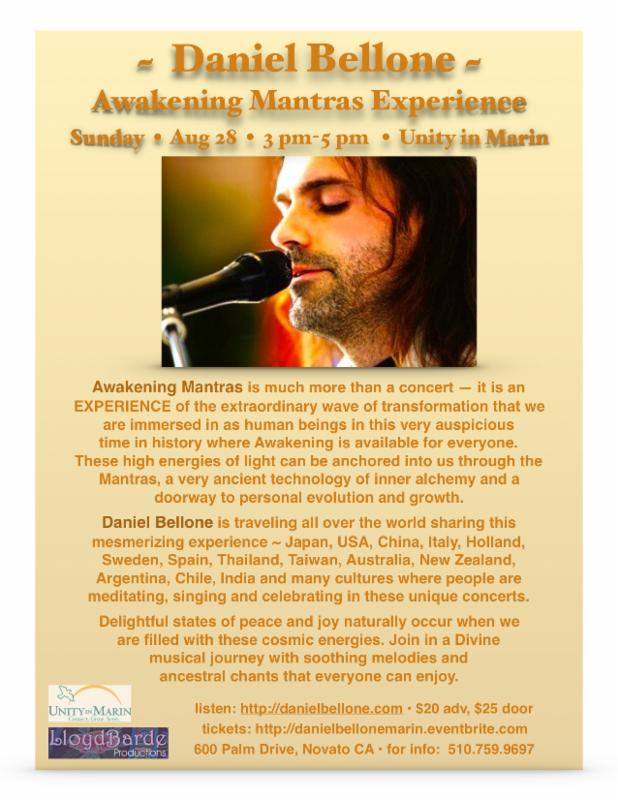 August 28 at Unity in Marin: Daniel Bellone Sunday afternoon from 3-5 pm. $20 adv