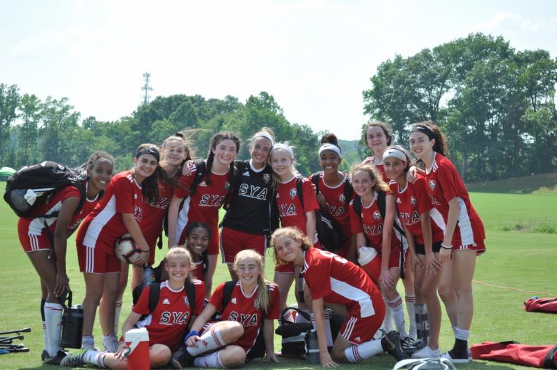 with the 1-0 win. The girls knew that NVSC was going to come out strong and want redemption. SYA started out with some nerves and NVSC took advantage with a goal at the 10 minute mark. The girls were not going down without a fight. The next 20 minutes were back and forth and SYA then tied it up 30 minutes in with a corner kick, from Mia Smith to Brianna Lawrence. This was all the fuel SYA needed and went into the 2nd half with momentum. SYA saw their winning goal with 10 left in the second half on a throw in from Leila Lajdel to Sam James. That goal clinched the trip to the finals.