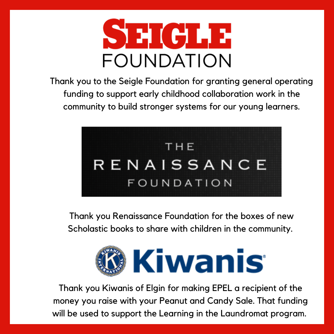 Our family engagement specialists build relationships and support families in various ways. Meeting families in neighborhoods, laundromats, mobile food pantries, or the community offers opportunities for families to connect and access resources where they are. We continue to see more children with families in laundromats. EPEL is looking for laundromats to expand this program in Elgin, Hanover Park and Streamwood. Contact us if you have connections.