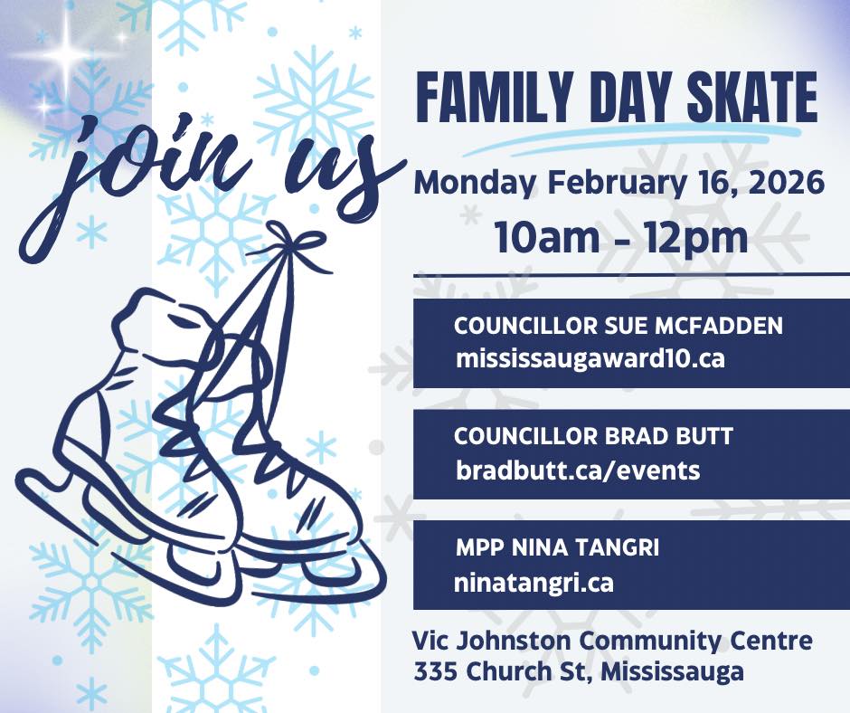 If you're looking for something fun to do during the Family Day long-weekend, grab your skates and join Councillor Sue McFadden, Councillor Brad Butt, and MPP Nina Tangri for a Family Day Skate, with FREE hot chocolate, snacks, and giveaways (while supplies last)!