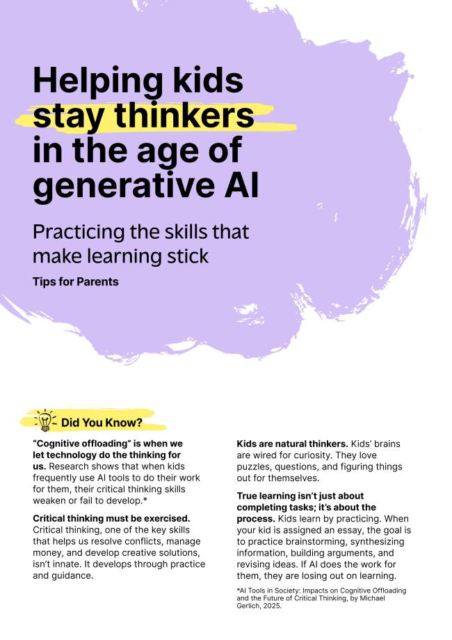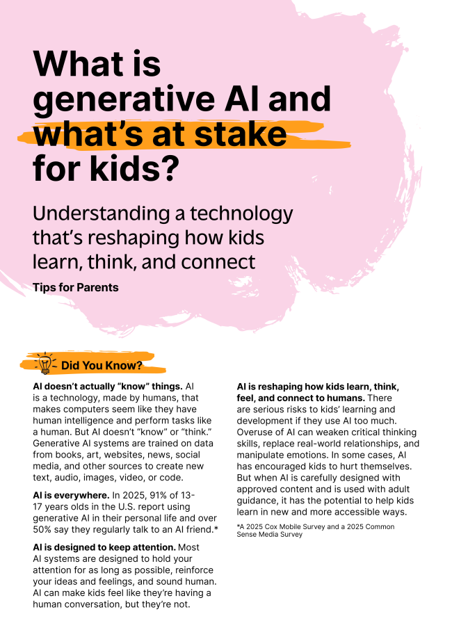 Recognizing the need for clear information and guidance, Brookings published a study titled "A New Direction for Students in an AI World: Prosper, Prepare, Protect." From this study, they've developed a series of tip sheets for parents of children aged 10-14. Available tips sheets are below and additional ones will be added in the coming months on their website.
