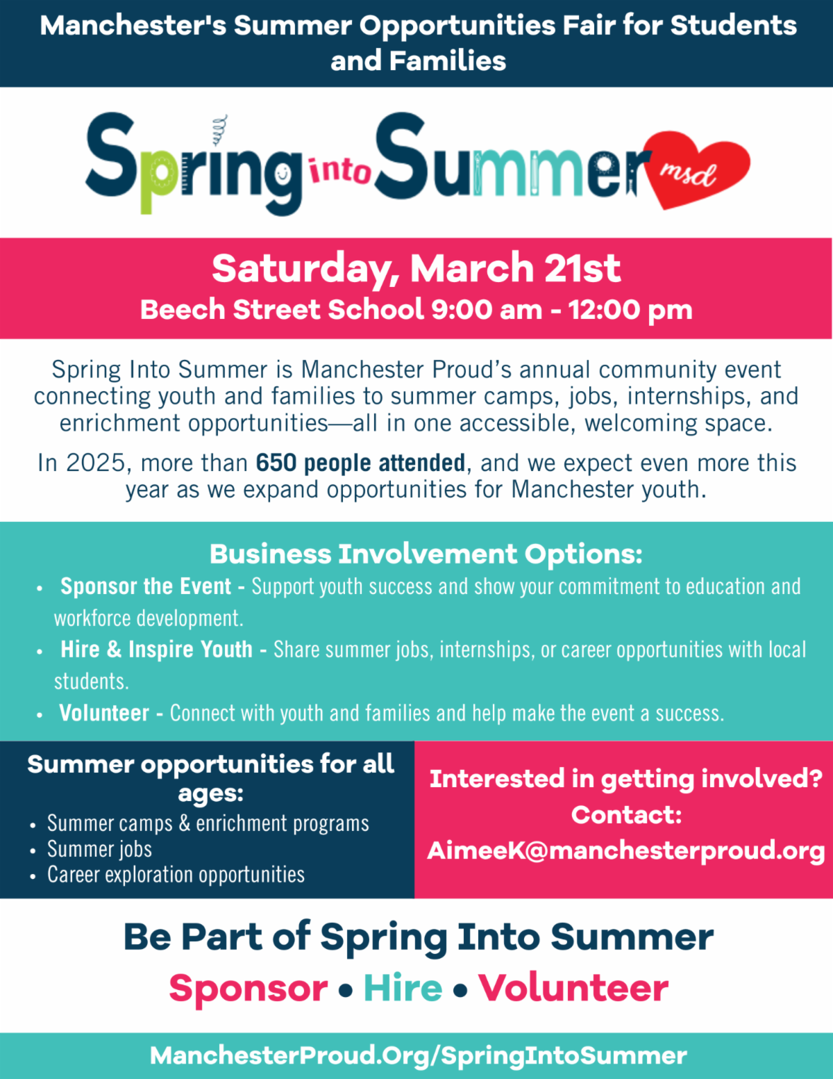 Spring Into Summer is Manchester Proud’s annual community event connecting youth, families, schools, and local businesses to meaningful summer opportunities.