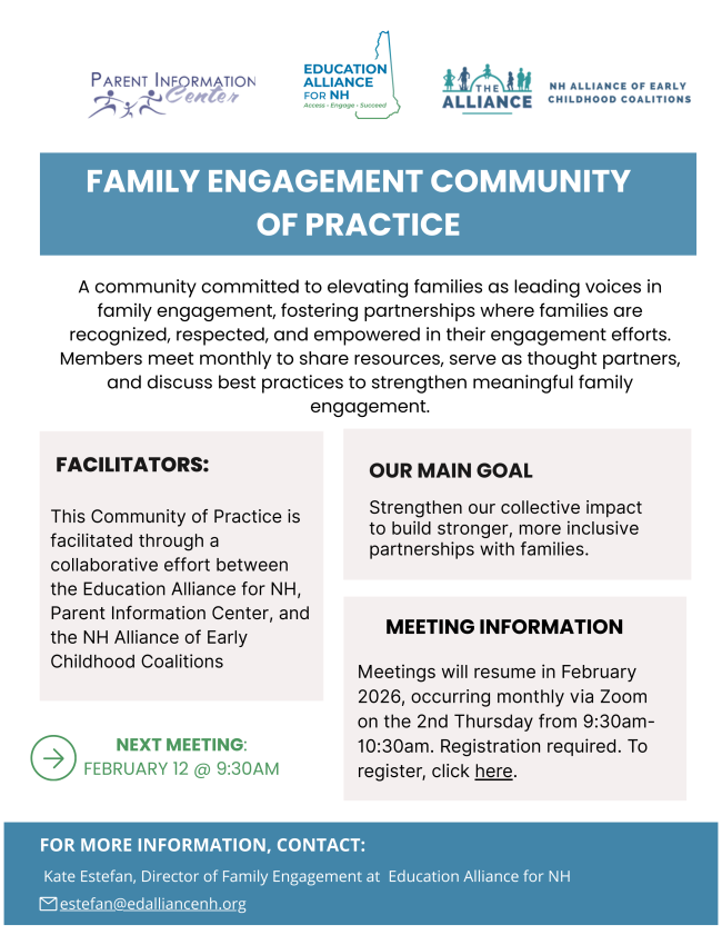 This Community of Practice is facilitated through a collaborative effort between the Education Alliance for NH, Parent Information Center, and the NH Alliance of Early Childhood Coalitions. Monthly meetings will occur on the 2nd Thursday of the month from 9:30am-10:30am. Registration required.