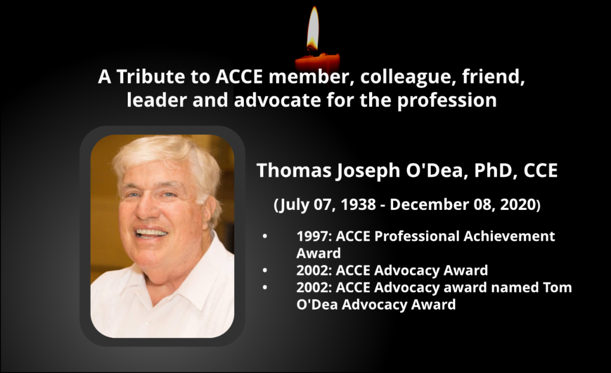 Tom O'Dea was a gentleman and a gentle man. Always open to discuss a wide range of clinical engineering topics, and always well informed. Tom did not just serve as Advocacy Chair for five years, he was an active leader and advocate for the profession, writing articles, rebutting criticisms, and strongly representing the best in our profession - always with dignity and grace. It was in recognition of his contributions to advocacy, beyond the chair, that prompted the Board to establish the Tom O'Dea Advocacy Award. I was privileged to work with Tom as recently as last year and found he had not lost any of his fervor for ACCE or clinical engineering. May he rest in peace.