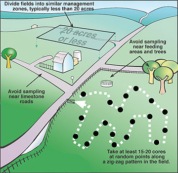 Walk in a "Z" Pattern, "M" Pattern, or "S" Pattern - Plan your walking path! Map your field using Geauga REALink (if you need help with this, please call) then plot a footpath for scheduled stops using these the letters "Z", "M", or "S". This gives your soil sample a good representation of the entire field.