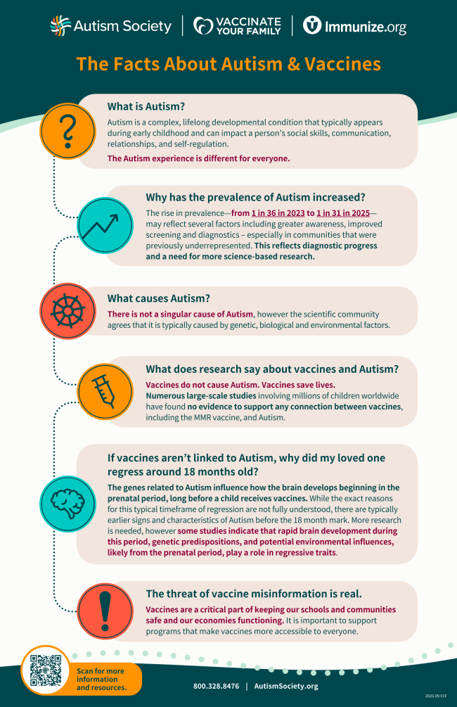 Medical misinformation and disinformation can be confusing for our patients. Pharmacy professionals can play a pivotal role in offering factual information from trusted sources. The Autism Society, Immunize.org, and Vaccinate Your Family have partnered to create a valuable tool based upon scientific evidence that shows no link between vaccines and autism. Help reassure and support families with facts.