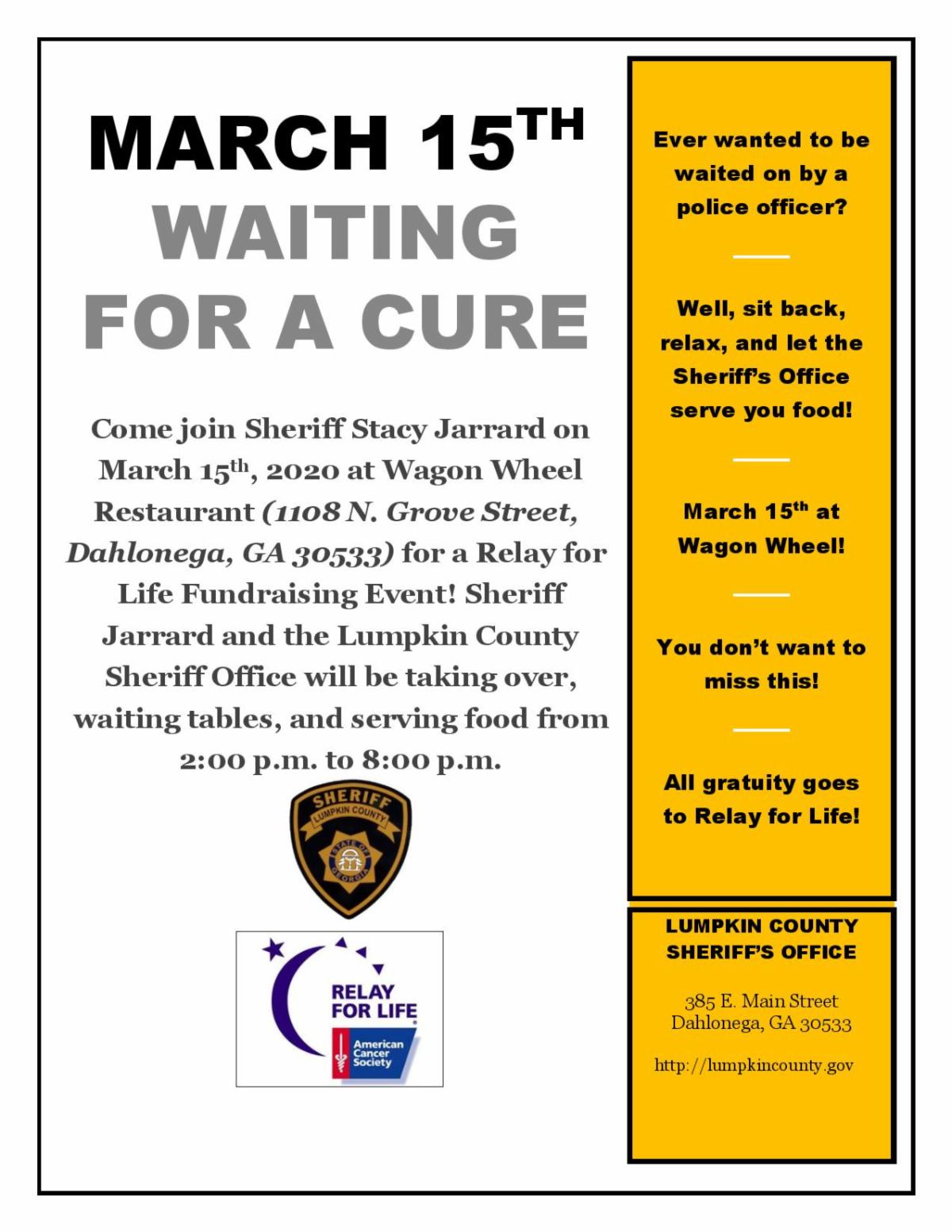 Jarrard and the Lumpkin County Sheriff's Office will be "taking over" the Wagon Wheel Restaurant on Sunday, March 15th from 2-8pm for the American Cancer Society Relay for Life. We will be working for gratuities. All the "tip" money raised will go to the American Cancer Society. Join us for an afternoon of good food, excellent service for a good cause. Thank you Ronnie Fortner and Rose Tompkins for always supporting this fundraiser.