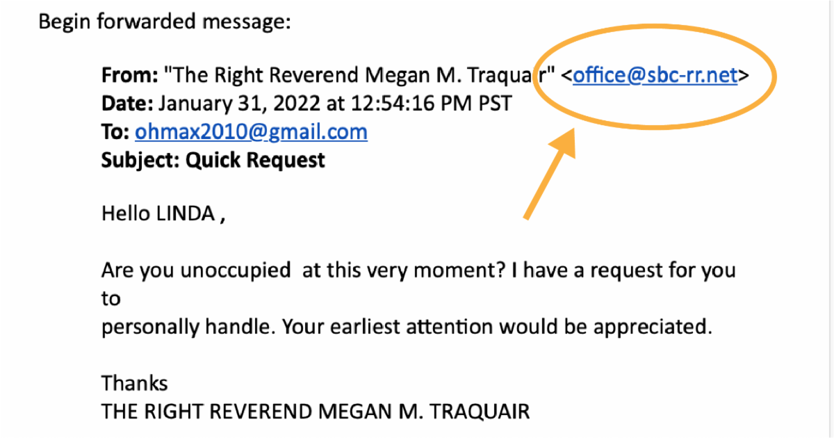 The scammers are at it again. Just a reminder that Bishop Megan will never email you with a mysterious request for support or money. Check the email address "The Bishop" is sending from. If you are unsure, please contact communications@norcalepiscopal.org. Do Not Reply to Bogus emails.
