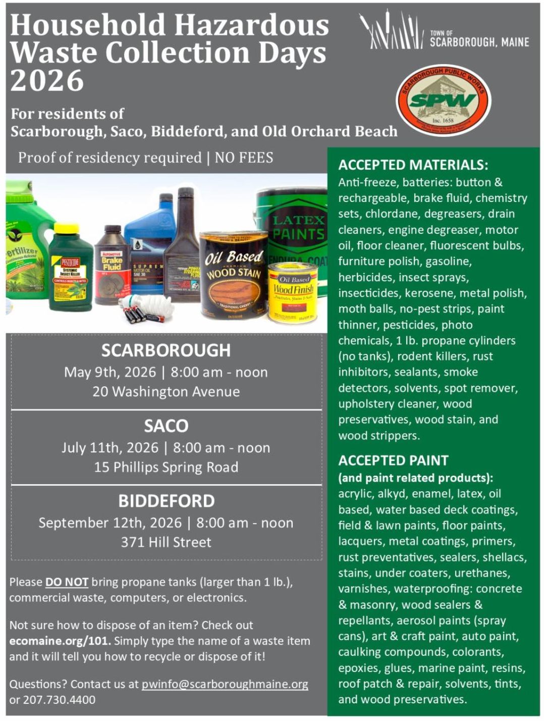 The Household Hazardous Waste Collection Days for 2026 have been scheduled! Safely dispose of items such as paint, cleaners, insect sprays, fluorescent bulbs, and more. These collection days are available to the residents of Scarborough, Saco, Biddeford, and Old Orchard Beach at no cost. Proof of residency is required.