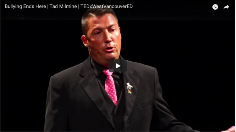 Tad Milmine, a police officer and founder of the Bullying Ends Here program, spoke at a September 2017 TEDx event held in West Vancouver where he told his heart-wrenching story about growing up with abuse, neglect and bullying while also struggling with mental illness.
