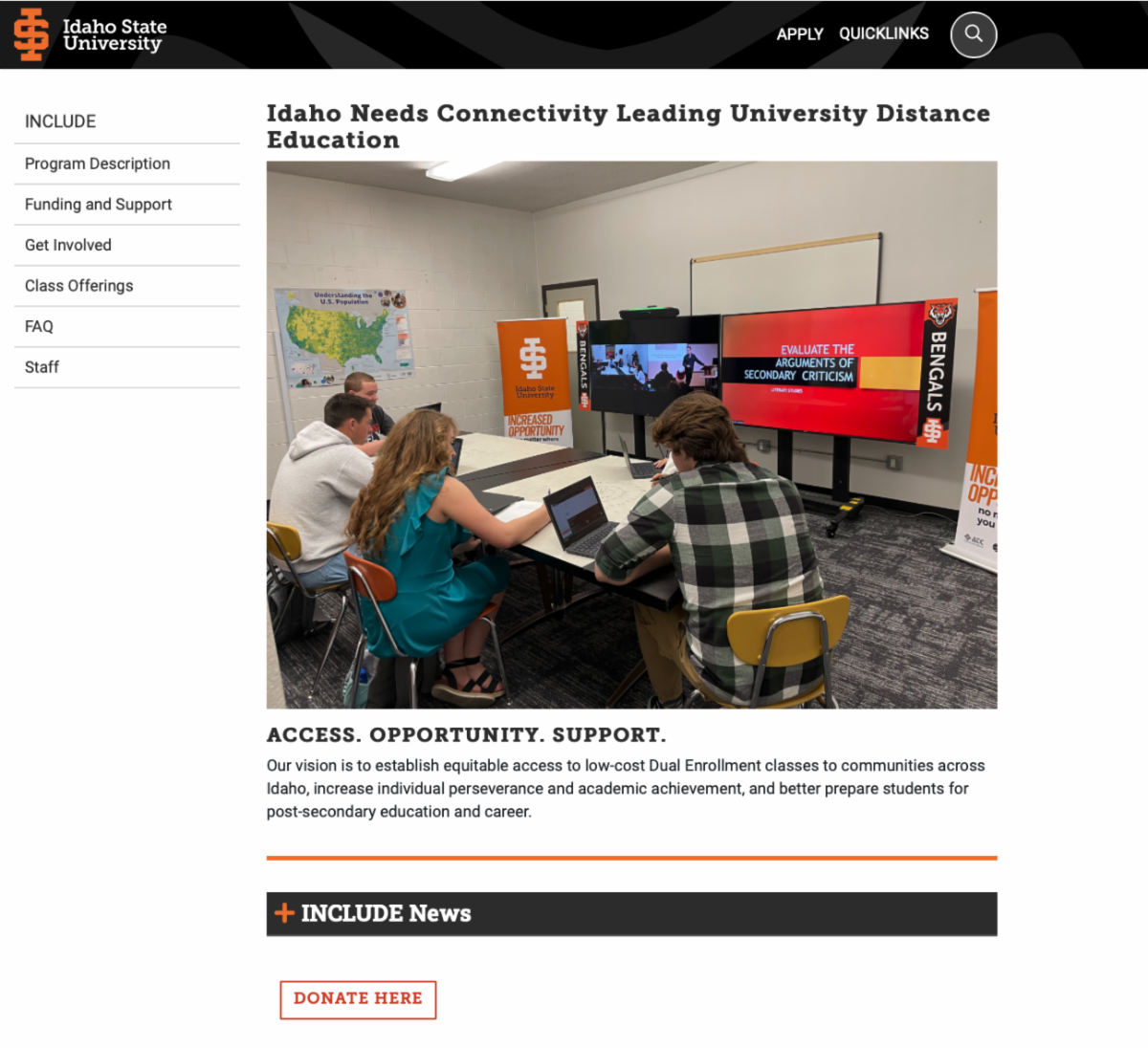 The INCLUDE Program provides technology and video equipment to rural high schools to allow learners to experience dual enrollment classes that previously were not available in their areas. The program is already operating in 10 Idaho schools with plans to grow and include more schools in the future.