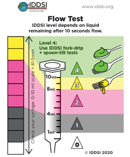 - The IDDSI flow test is designed to test the ability of a liquid to flow in conditions related to swallowing a bolus. The thickness level of the liquid is defined by the amount of fluid remaining after 10 seconds using the IDDSI Funnel or alternatively, a 10 ml syringe of the correct dimensions (see below).