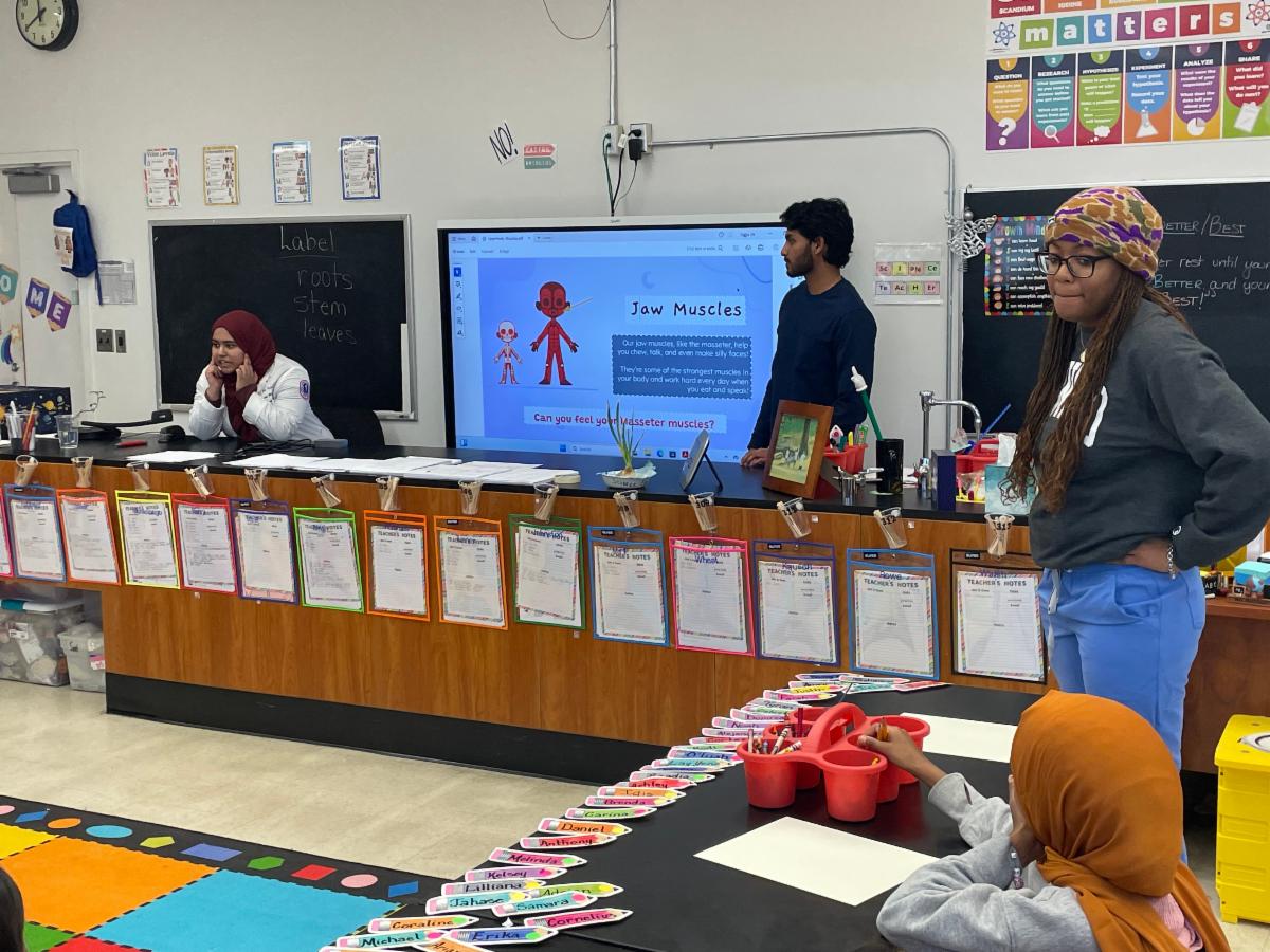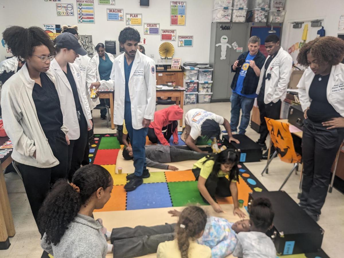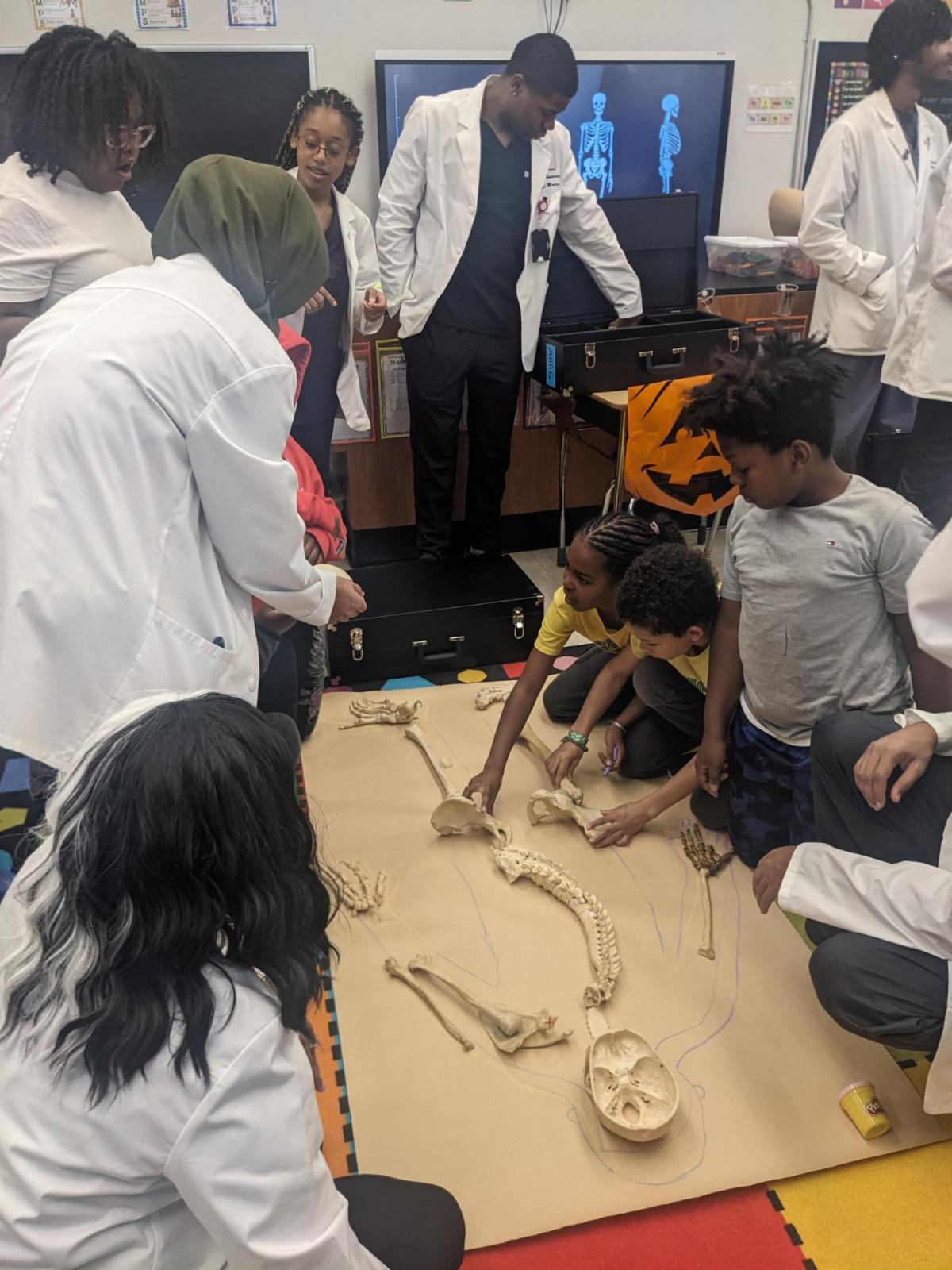 Our list of activities included learning first aid (Sept 26, 2024) where they learned how to use a kit, clean and dress a wound at the end of the day the kids got to take home their own first aid kit. One of the kids in the class carries her first aid kit in her backpack every day and proudly states that she has used it on her family and friends. Our second day coincided with Halloween, so we engaged the students in learning about the skeletal system and they learned how to use a splint (October 24, 2024). Our third day, students learned about lung health and learned how to use a stethoscope which they were able to keep to use at home with their families (November 21, 2024). On December 12, we held our gastrointestinal and nutrition day in collaboration with the Dental School. Kids learned the sugar content of some common items to realize that apple juice has as much sugar as 3-4 Krispy Kreme donuts. On January 23, the students learned how the hand moves and built their own hand model. Our next event will be on February 20 where will once again partner with the Dental School to build their own dental molds. On March 20 we are planning our dermatology day followed by career day on April 24 with Dean Hayes-Dixon leading the mini-white coat ceremony and our modified Hippocratic Oath.