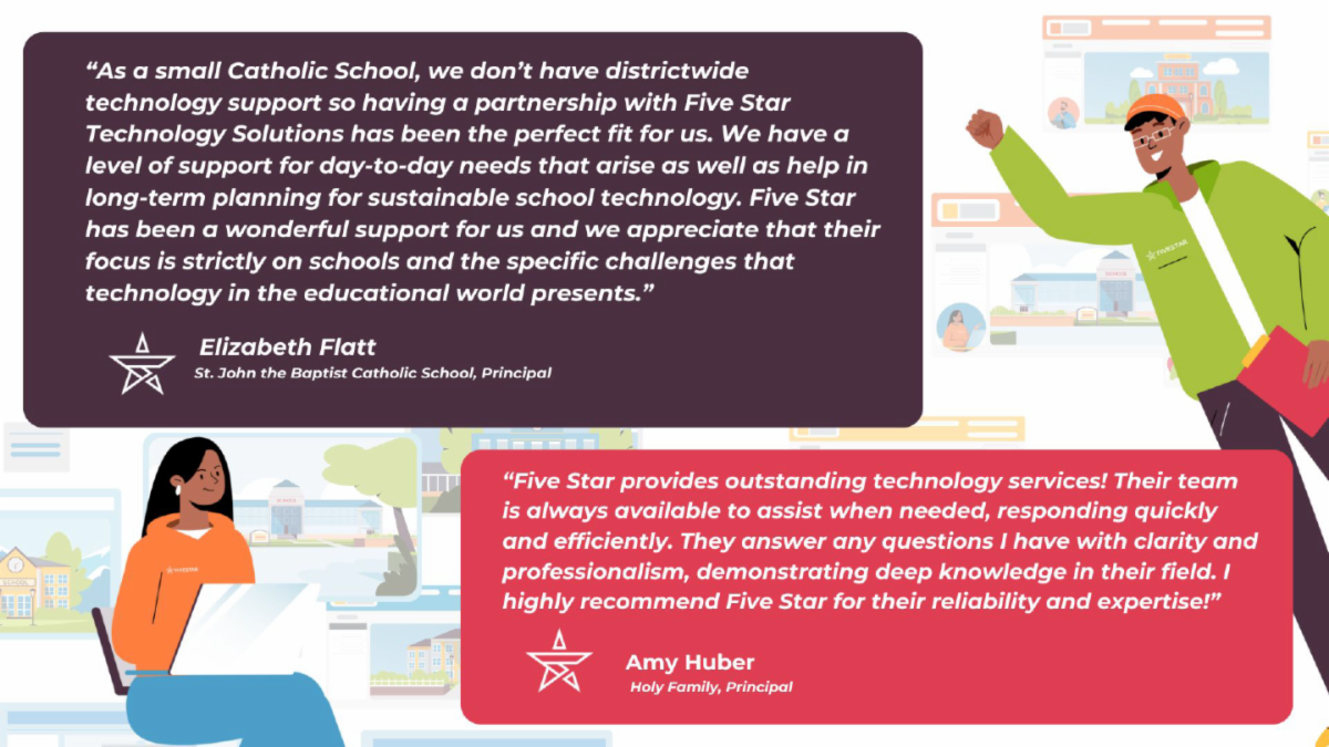 At Five Star Technology Solutions, we are dedicated to providing innovative and customized technology solutions that empower K-12 districts and dioceses to thrive. We understand the unique challenges dioceses face, and we are committed to working closely with them to develop tailored strategies that enhance educational experiences, streamline operations, and improve overall learning outcomes. Our team is here to support dioceses with comprehensive, scalable solutions that drive success in both the classroom and administrative environments. Together, we can build a future where technology supports the mission of education at every level. | |