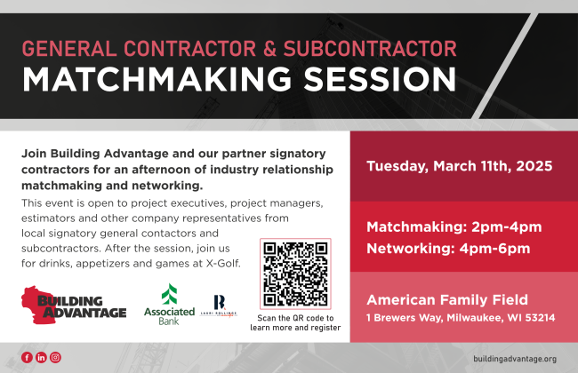 Building Advantage is proud to coordinate with our partner trade associations, ACEA, AGC of Greater Milwaukee, NECA Milwaukee and PMSMCA on this exciting event. Thank you to our event sponsors Associated Bank and Lauri Rollings & Associates.