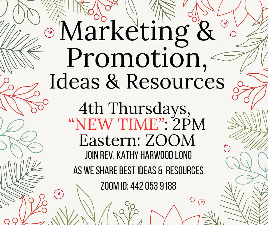 4TH THURSDAY 2PM ET Church Marketing & Promotion Ideas, Led by Rev. Kathy Harwood-Long Zoom Meeting ID 442 053 9188