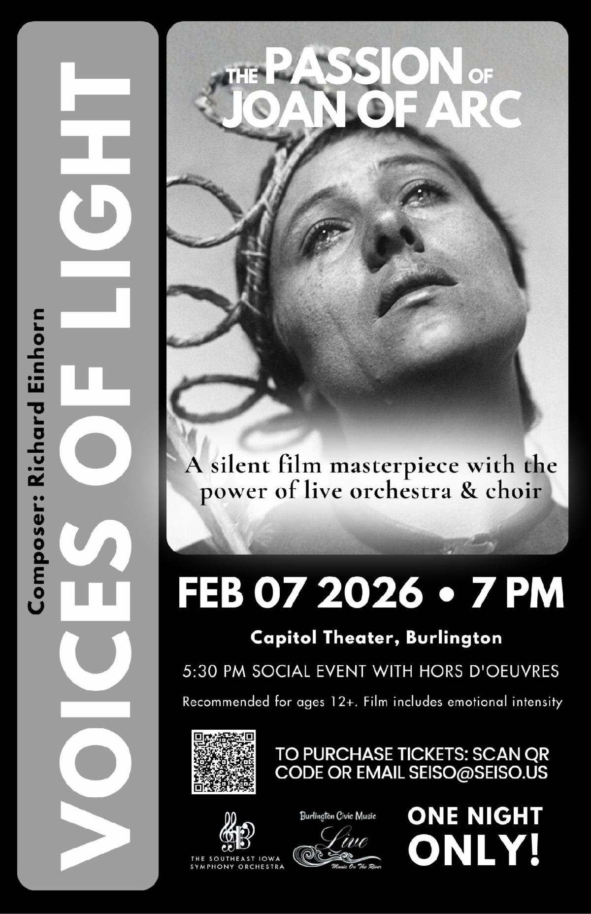 Downtown Burlington sets the stage for an unforgettable evening on February 7 as Burlington Civic Music, the Southeast Iowa Symphony Orchestra, and the Capitol Theater present Voices of Light.