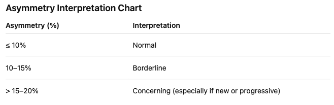 • Expected Asymmetry: Dominant hand being 5–10% stronger is benign.