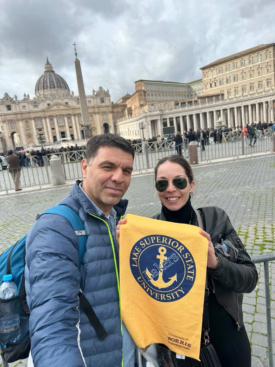 | | Photo of the Month: This month’s Photo of the Month features Nemanja and Radmila Mijailovic, parents of LSSU swimmer Dimitrij Mijailovic (Sophomore, Business, from Zlatibor, Serbia), on their recent trip to Vatican City — reaching the center and proudly showing their Laker pride! | | | | |