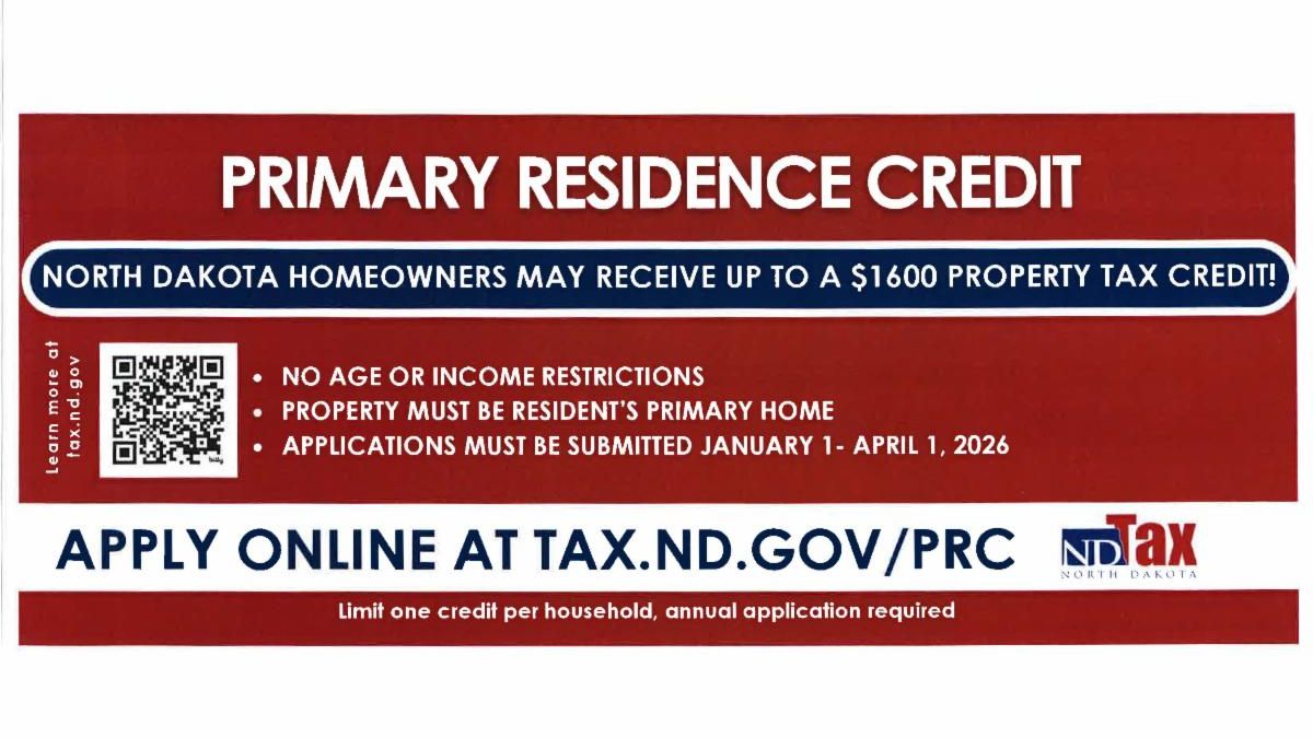 | | Apply for the Primary Residence Credit | | The Primary Residence Credit provides homeowners the option to apply for a $1,600 state property tax credit through the Office of State Tax Commissioner. The application is open through March 31. Home owners must reapply every year. Learn more and apply at tax.nd.gov/prc. | | Sign Up for Hyper-Reach Emergency Alerts | | |
