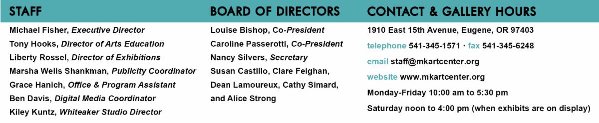 | | We want to thank the many volunteers, Board members, Staff, Art Center friends, and patrons who contributed their time, talents, and treasure for the benefit of Maude Kerns Art Center. | | Maude Kerns Art Center programs are made possible in part by: | | | | |