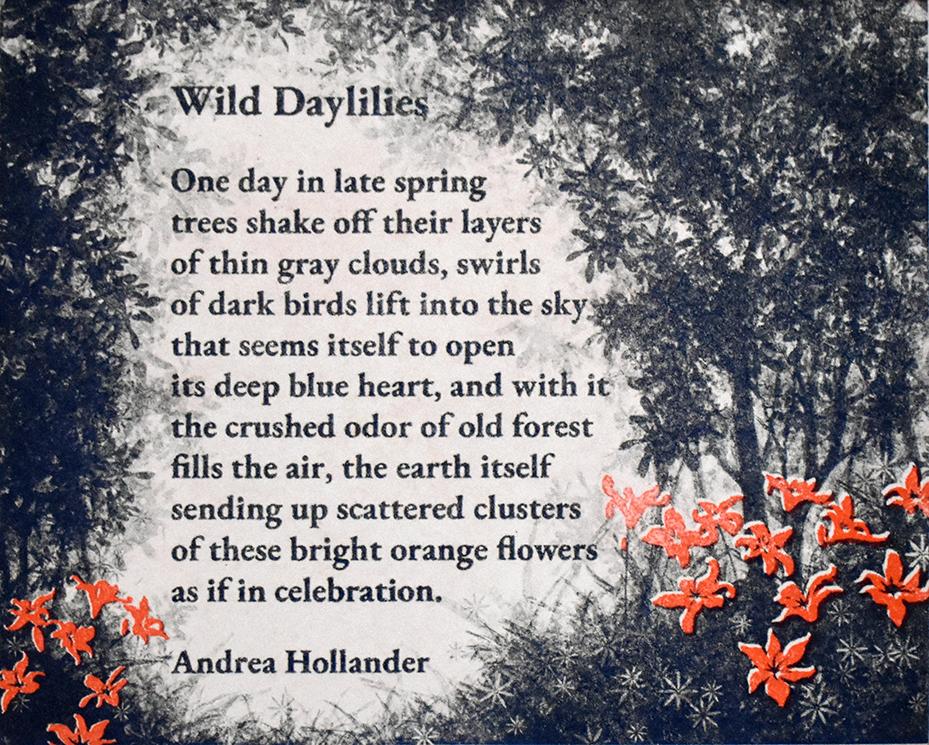 Pictured: Solar plate of Andrea Hollander’s poem Wild Daylilies, with printed elements by Heather Halpern
